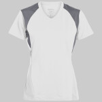 100% polyester wicking mesh * Wicks Moisture * Ladies' fit * Tagless label * V-neck collar * Contrast color inserts